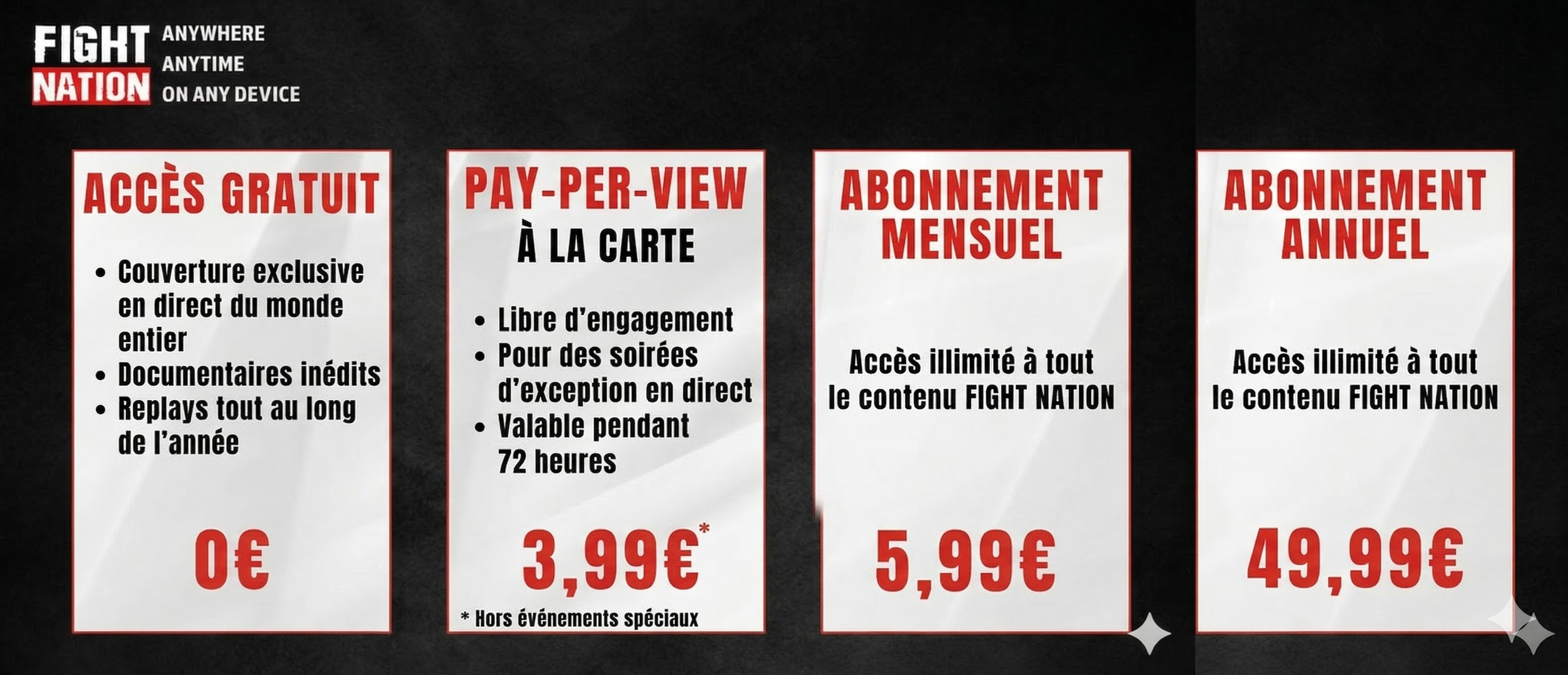 - Avec un abonnement annuel vous donnant accès sans limite à tous les contenus de FIGHT NATION.